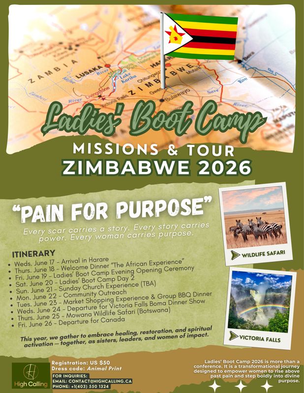 Step away from the noise and rediscover God’s purpose for your life at this faith-filled retreat in Zimbabwe—created for women’s groups, ministry teams, couples, and those seeking true spiritual renewal. Ladies’ Boot Camp Missions & Tour 2026 is a sacred time of worship, healing, outreach, and deep fellowship in a breathtaking setting. Come be refreshed, strengthened in your calling, and surrounded by a global sisterhood in Christ—reserve your place and step boldly into your purpose.